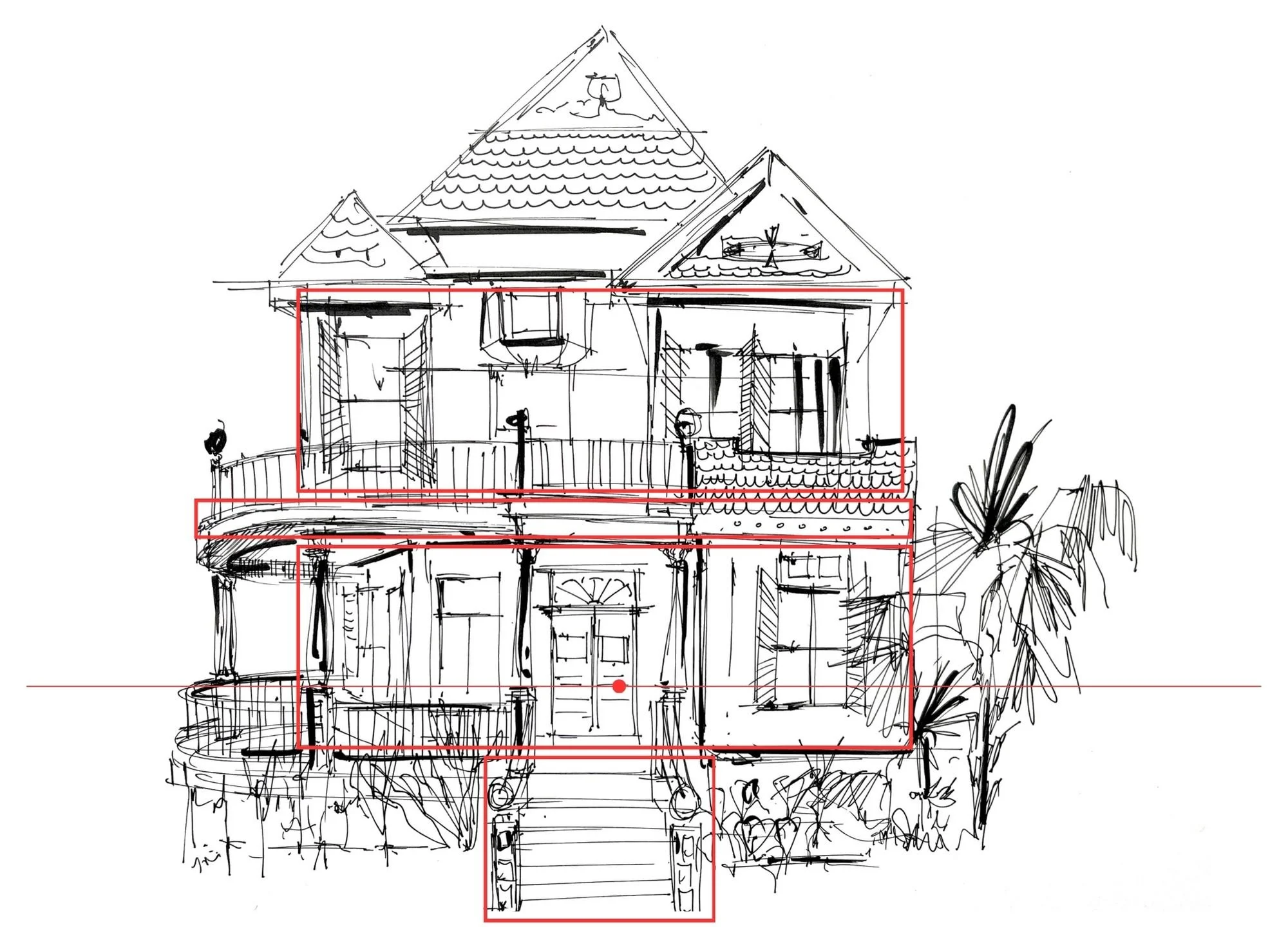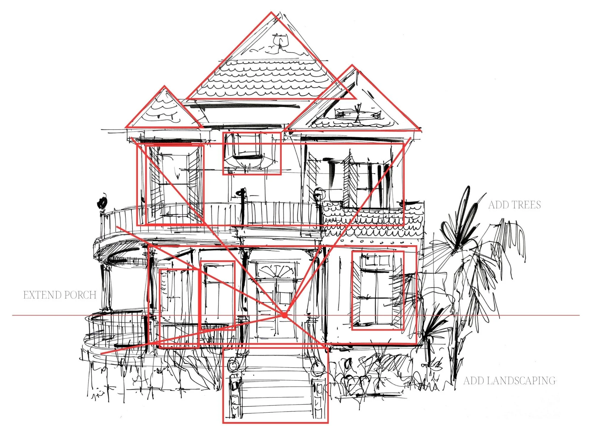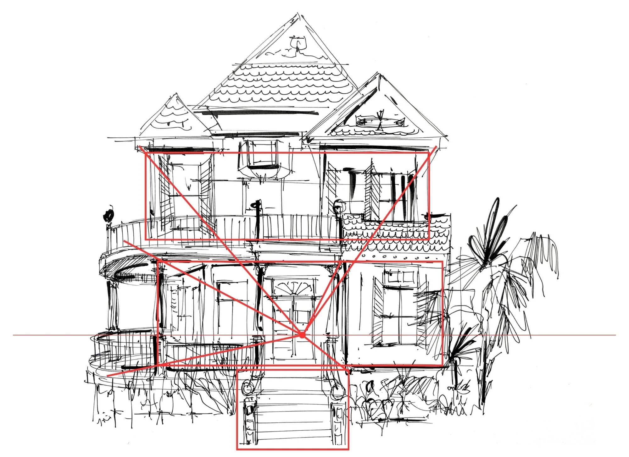 Find it. Mark it on the horizon line. That little dot is where everything converges. Rooflines, porches, sidewalks, all those lines are headed there.