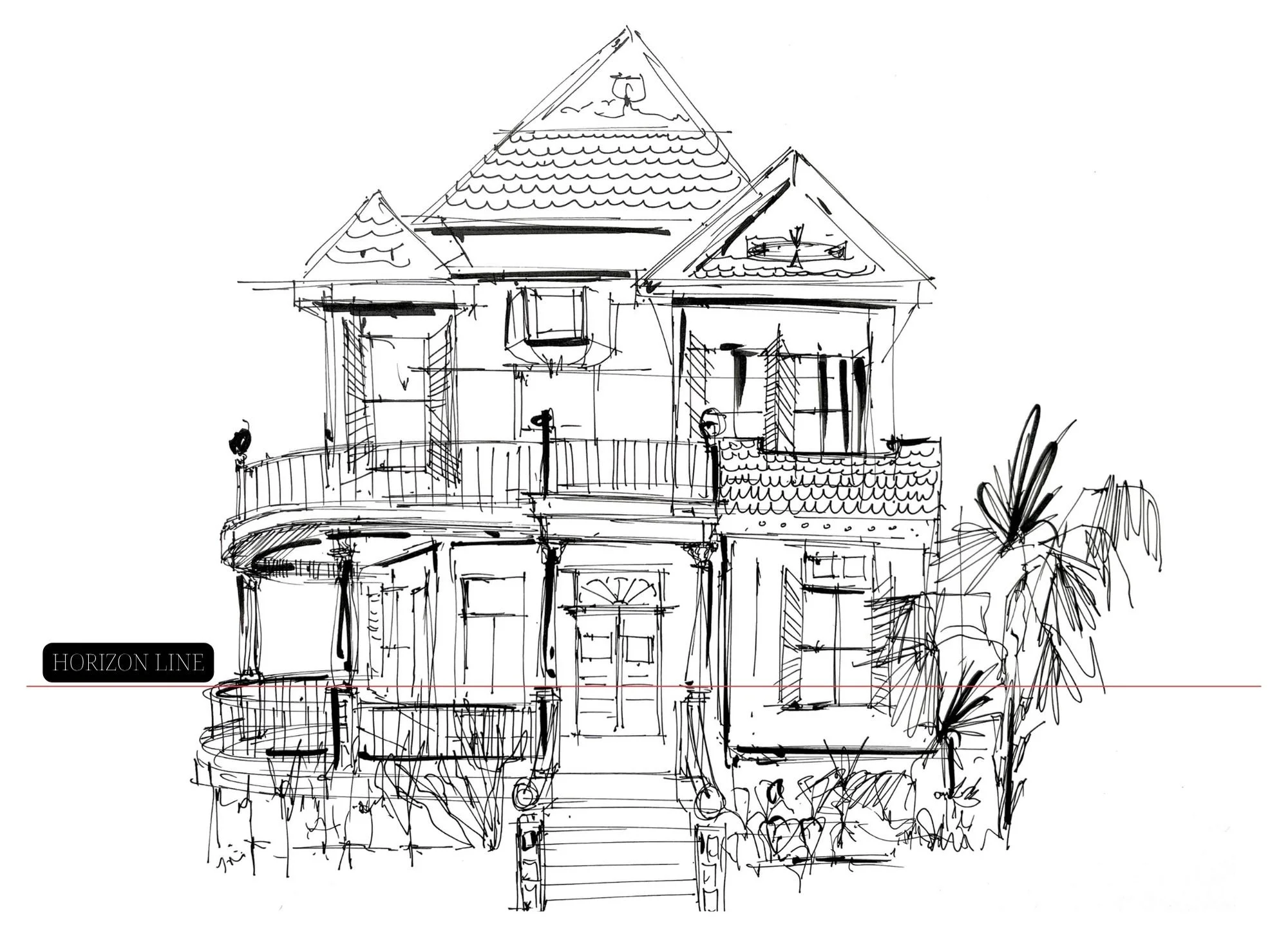 Take those roof edges, porch lines, window sills, anything that moves away from you, and angle them back to your vanishing point. That’s perspective doing its job.