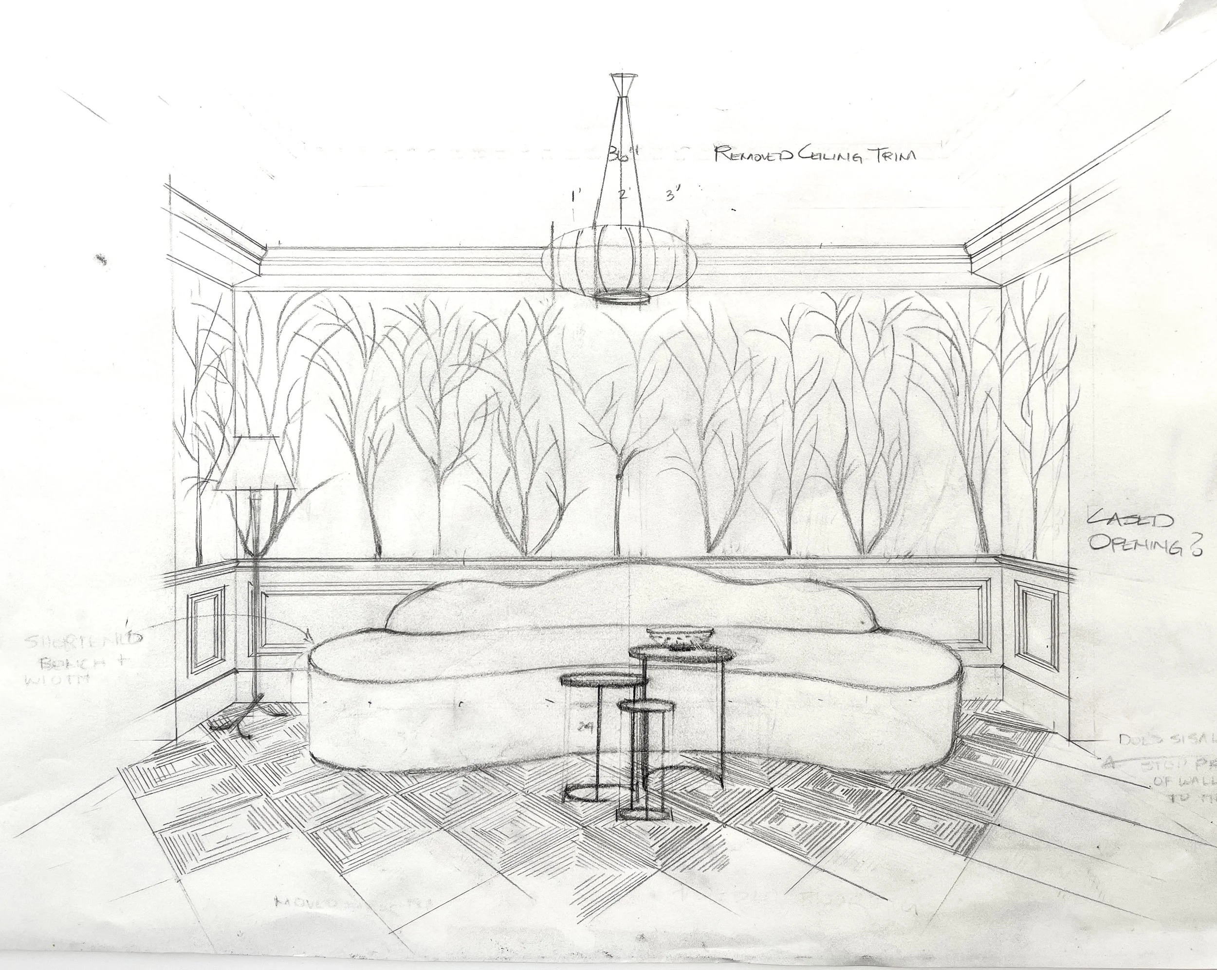 4. The pencil phase also gives room for design tweaks. This part is key. Once Samantha saw the drawn space with her furniture selections in place, she actually adjusted the sofa back. The sketch gave her clarity—and helped her refine the design before final install.