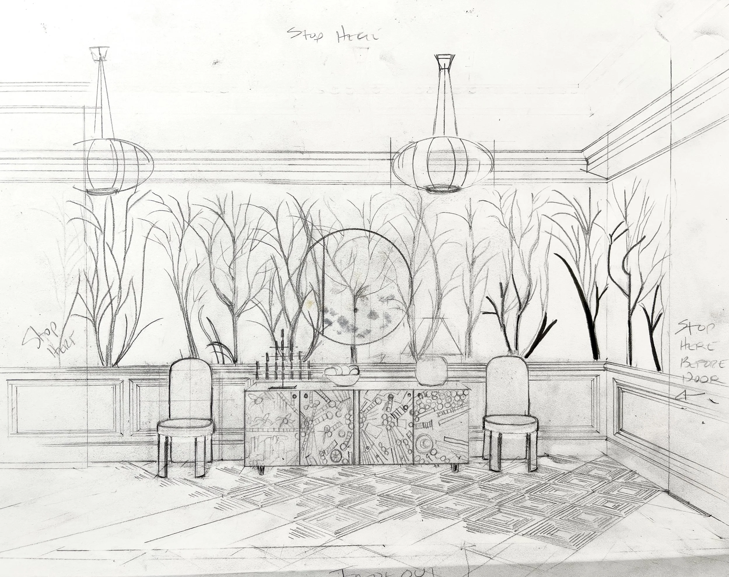 3. Next: to-scale pencil drawings. These aren’t loose doodles. We draw the entire space to scale, incorporating all the chosen elements—furniture, lighting, textiles—so you can see the room come together before color is ever applied.