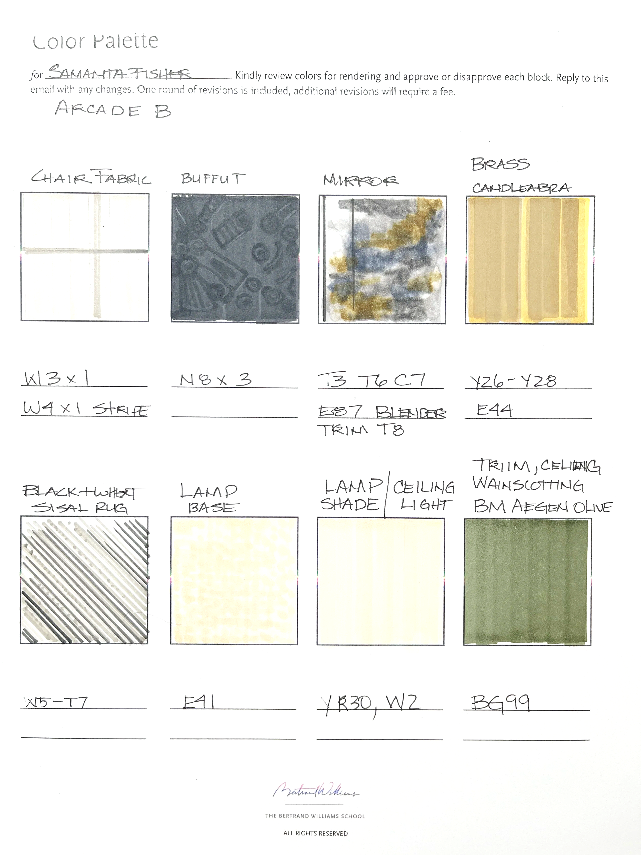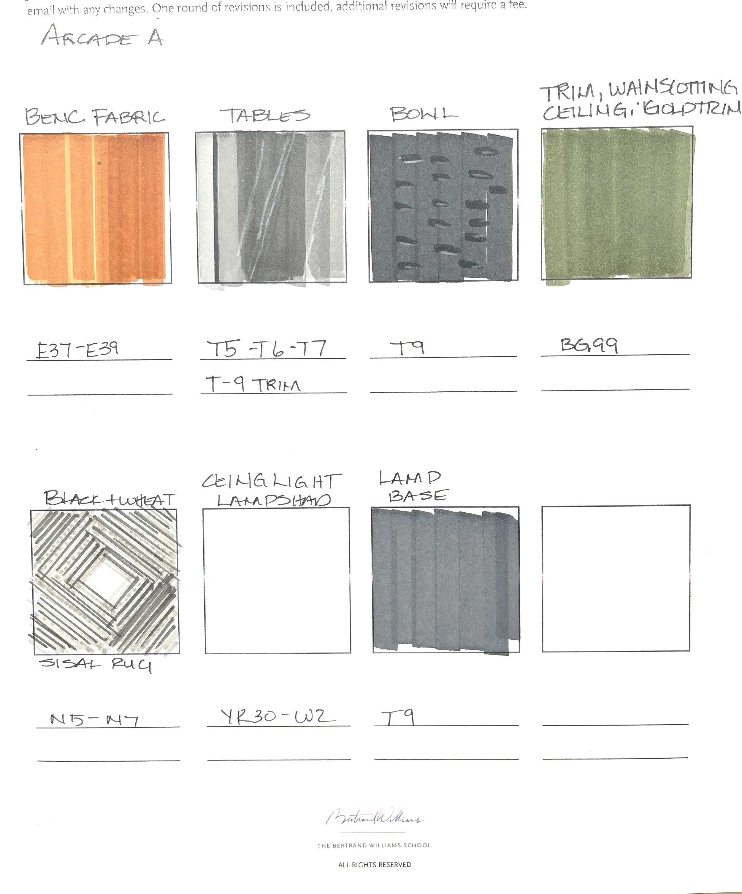 5. Then we build the color palette. We match markers to your actual finishes, paint, fabric, flooring. Once the palette is approved, we move into full color rendering.